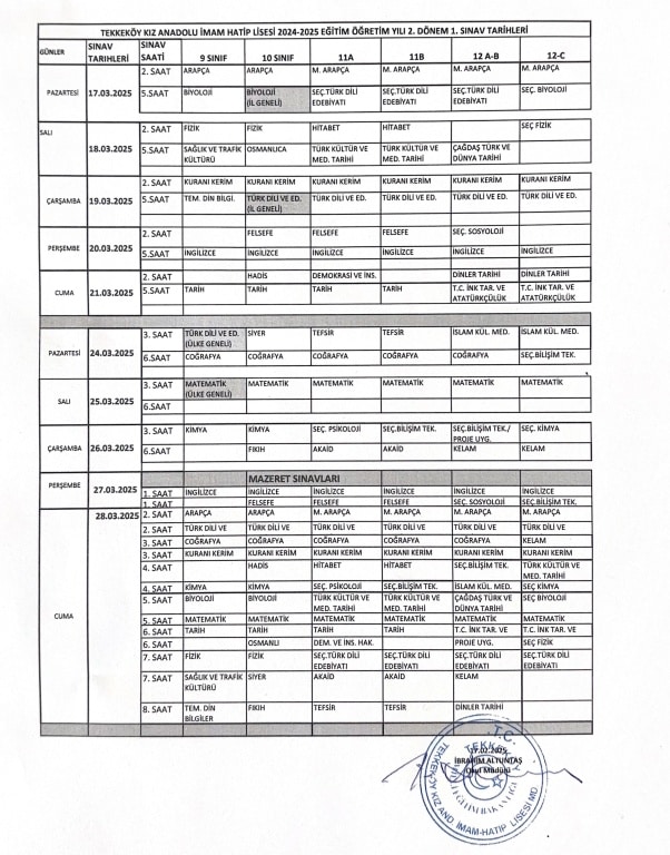 2024-2025 EĞİTİM ÖĞRETİM YILI 2.DÖNEM 1.SINAV TARİHLERİ
